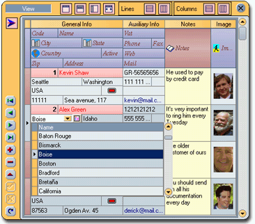 TJfDbGrid, highly sophisticated and fully customisable, this grid can support any kind of columns and bands: calendar, calculator, masks, lookups, package images, images, buttons, checks, combos, etc. Every record may be formed by multiple rows. General summaries by columns. Sorting.
